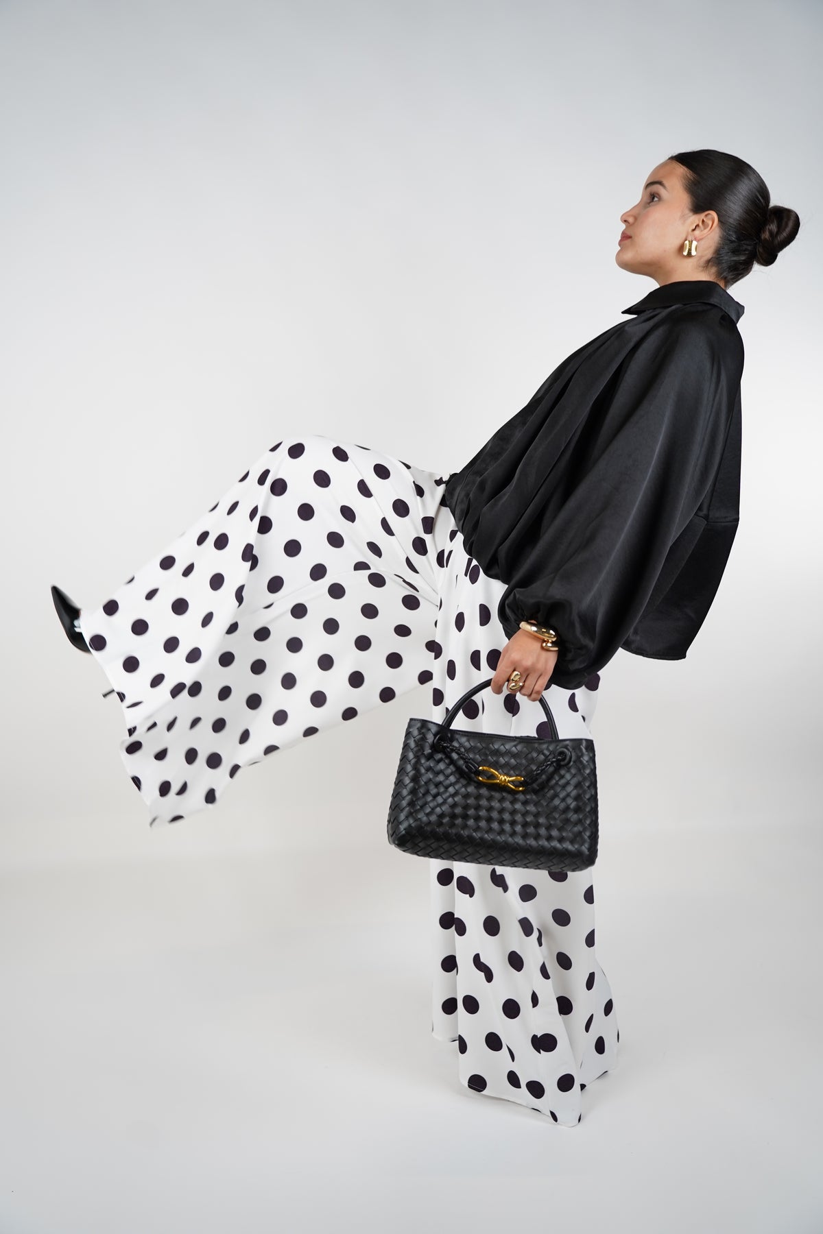 Model wearing high-waisted black and white polka dot wide-leg palazzo pants with satin black bomber and black handbag.