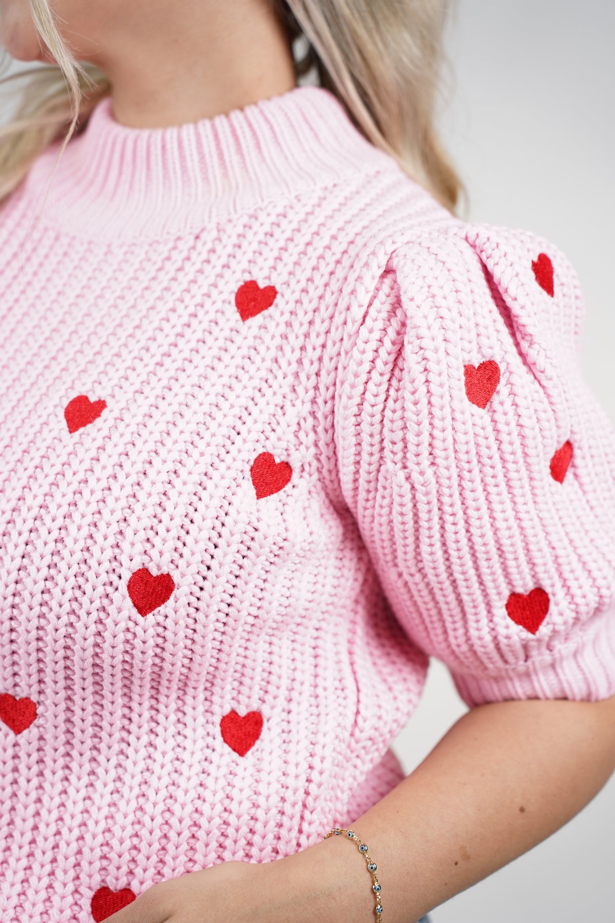 A cozy knit sweater designed with a playful heart pattern and a soft, feminine feel.