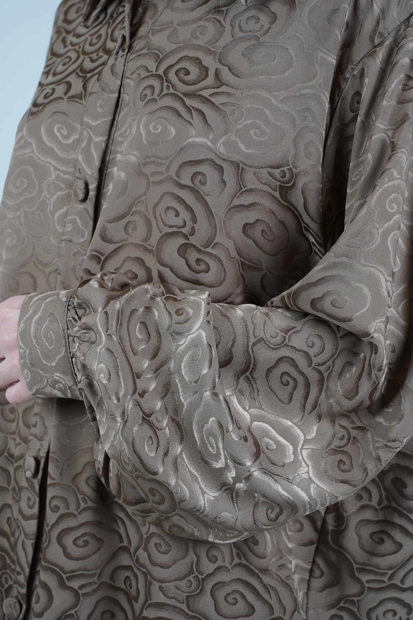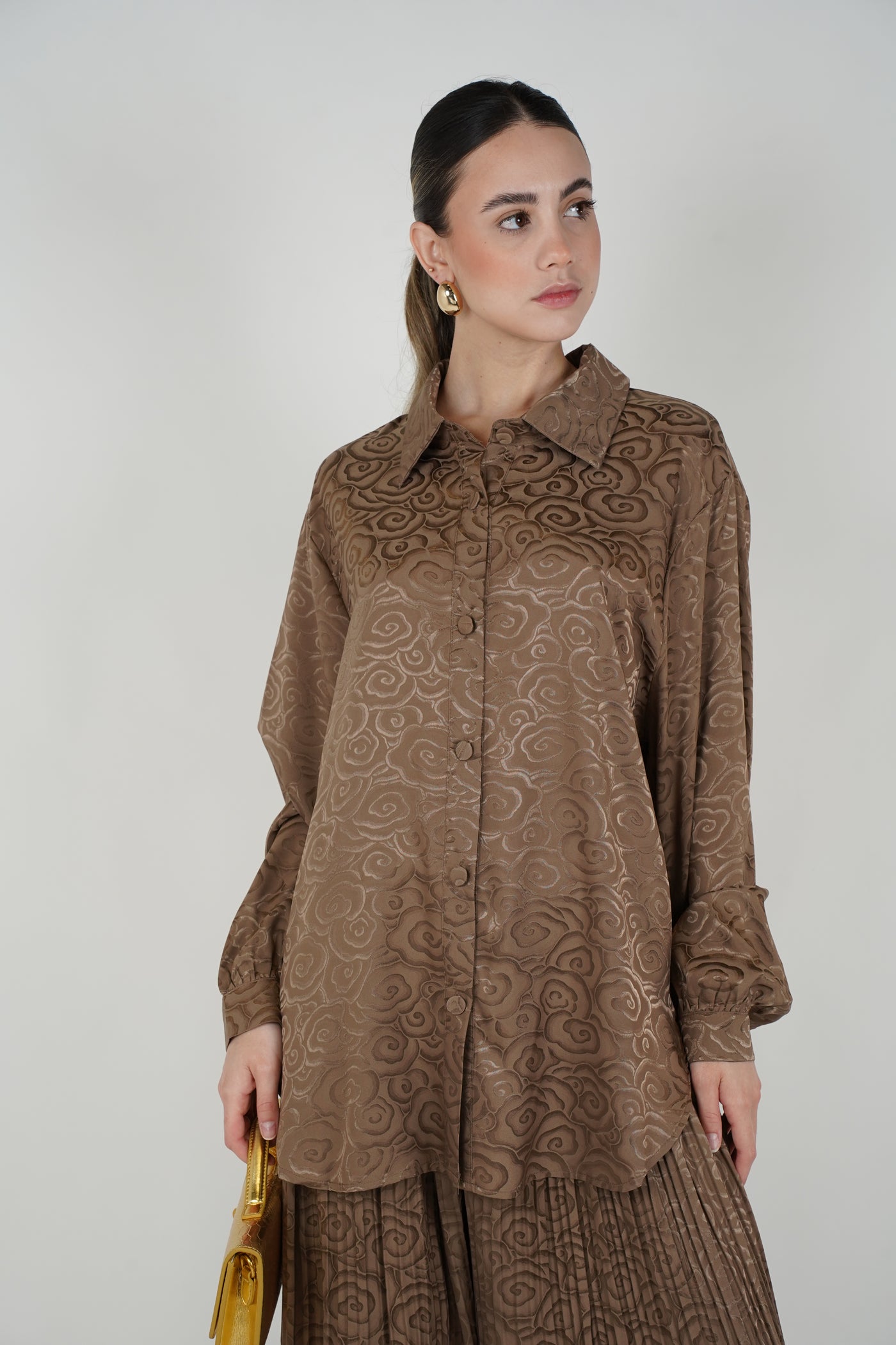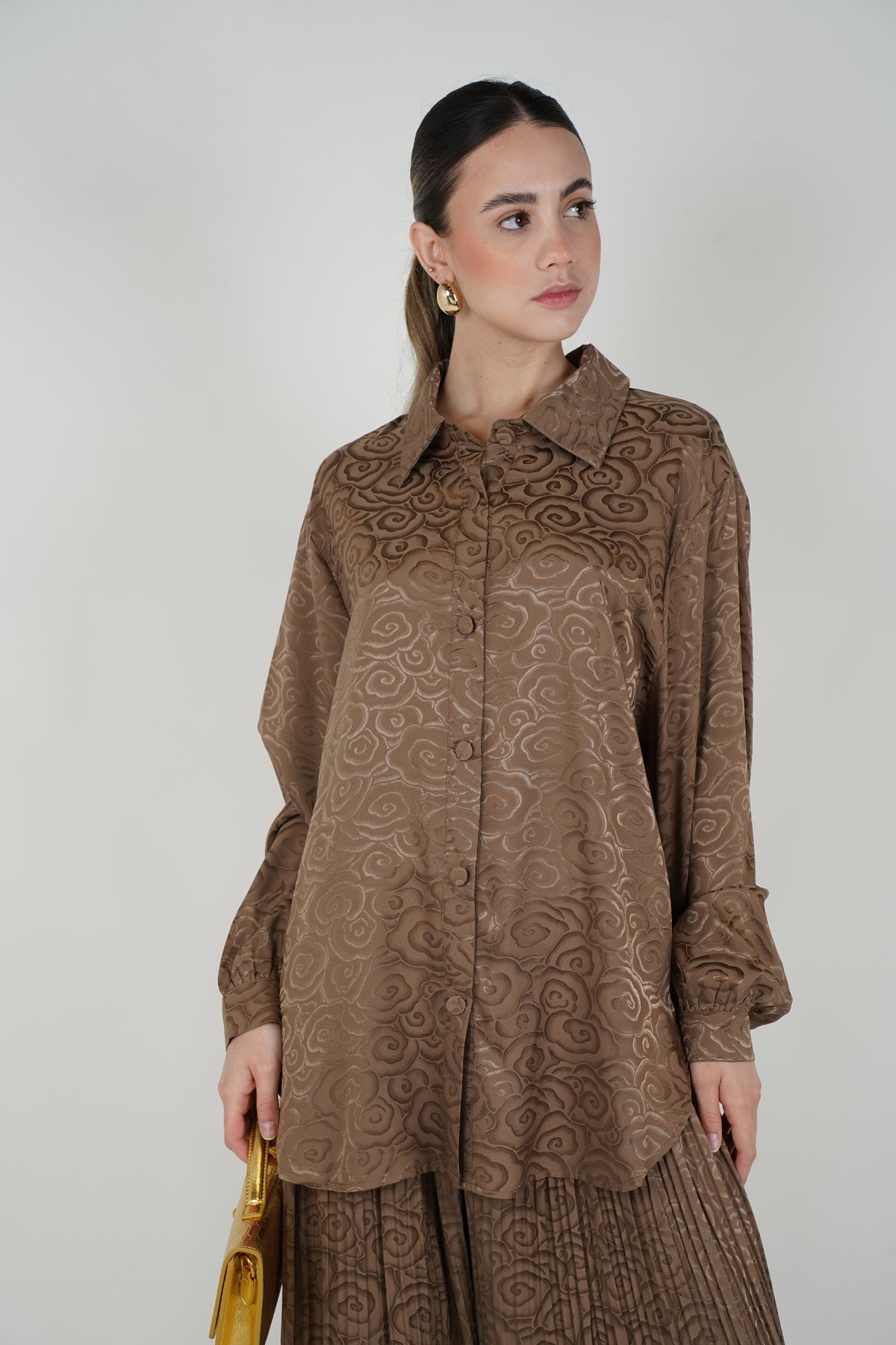 Details Color: Brown Pattern: Textured swirl pattern Fit: Relaxed Length: Full length pants Sleeves: Long sleeves Neckline: Collared neckline Waistband: Not visible Closure: Front button closure (top) Pockets: Not visible Stretch: Not visible Material: To be confirmed Care: To be confirmed