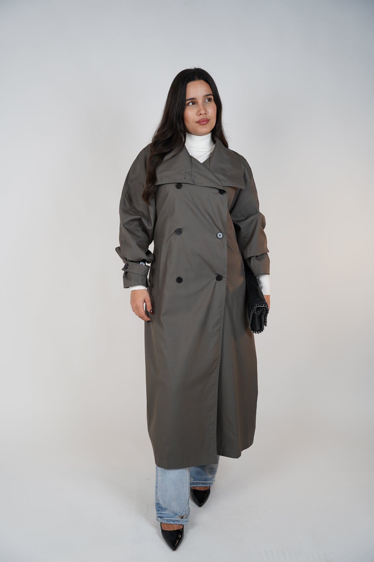 Details Color: Olive gray Pattern: Solid Fit: Relaxed Length: Midi Sleeves: Long sleeves Neckline: Wide collar Waistband: Not applicable Closure: Double-breasted button front Pockets: Not visible Stretch: Not visible Material: To be confirmed Care: To be confirmed