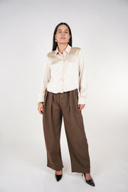 A silky champagne cropped blouse with a clean button-down design, soft drape, and a refined, elevated finish.