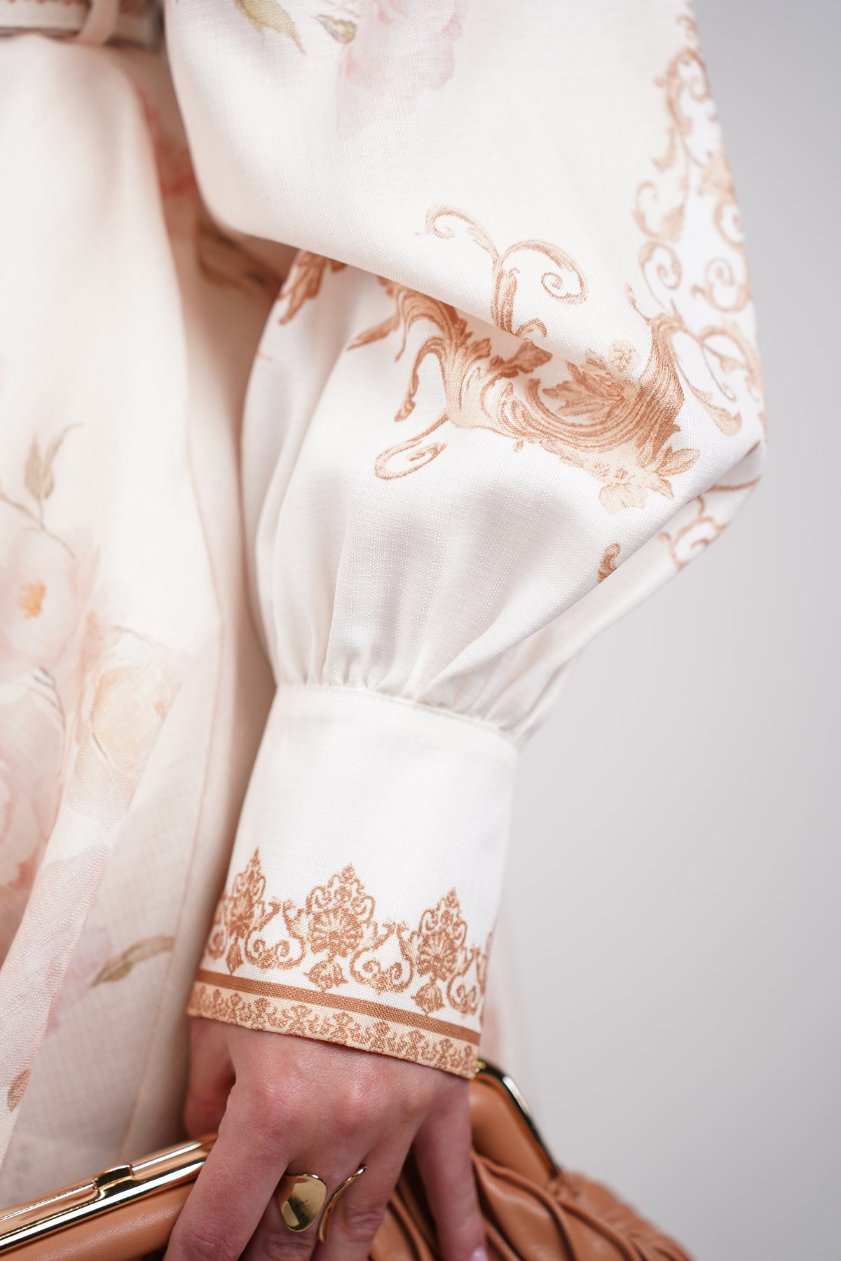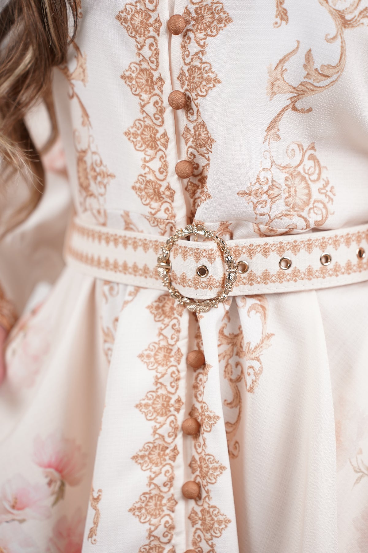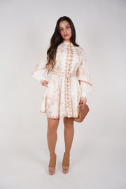 Details Color: Soft ivory with blush and tan accents Style: Mini dress Neckline: High neckline Sleeves: Long balloon sleeves Closure: Button front with removable belt Fit: Flowy with waist definition