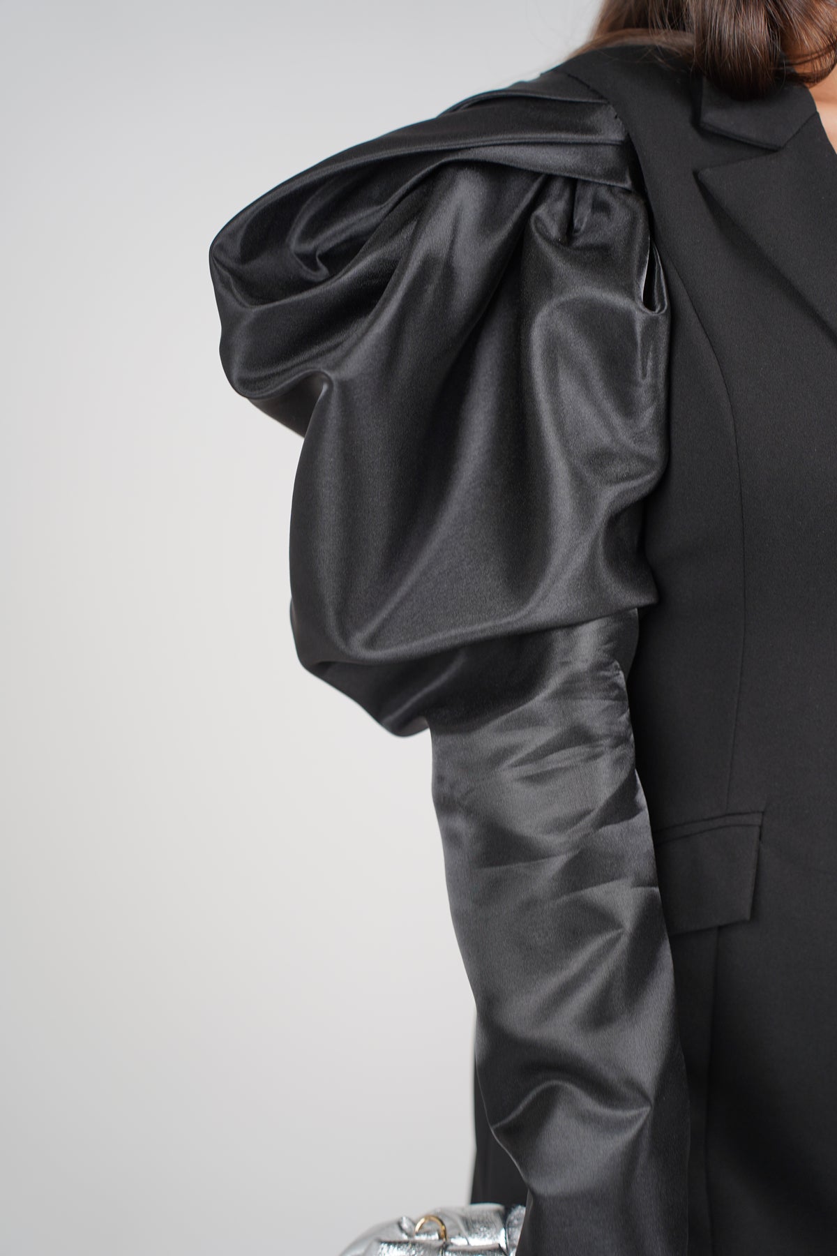 A bold and elegant mini blazer dress designed with dramatic puff sleeves and crystal-style buttons for a powerful, ultra-chic statement.