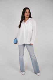 An effortless oversized button-down with soft stripes and a relaxed, polished feel.