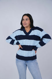 Striped cable-knit sweater with V-neckline and ribbed trim worn with light-wash jeans on a model against a neutral background.