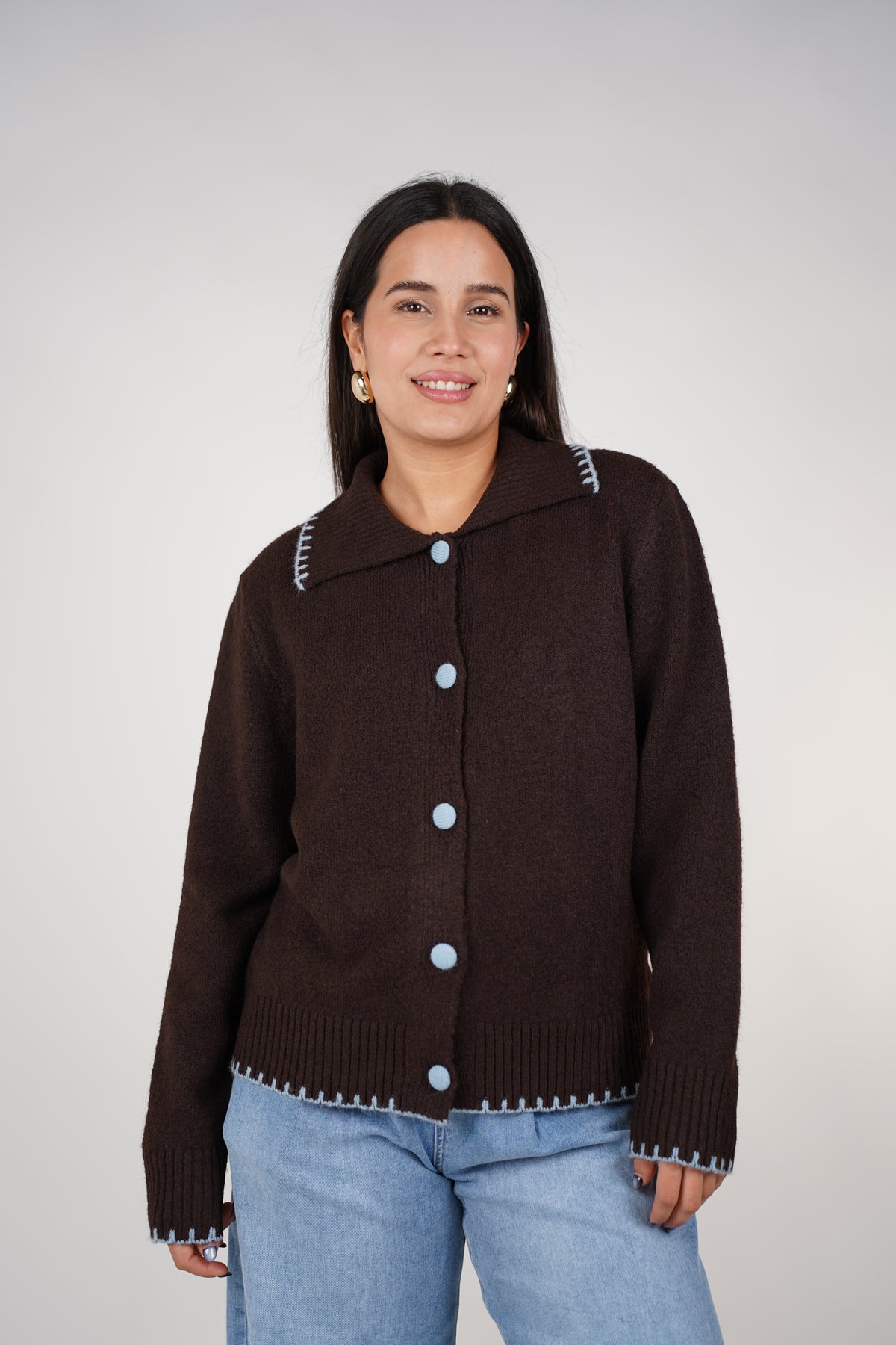 Brown cardigan with baby-blue contrast stitching and buttons worn by model.